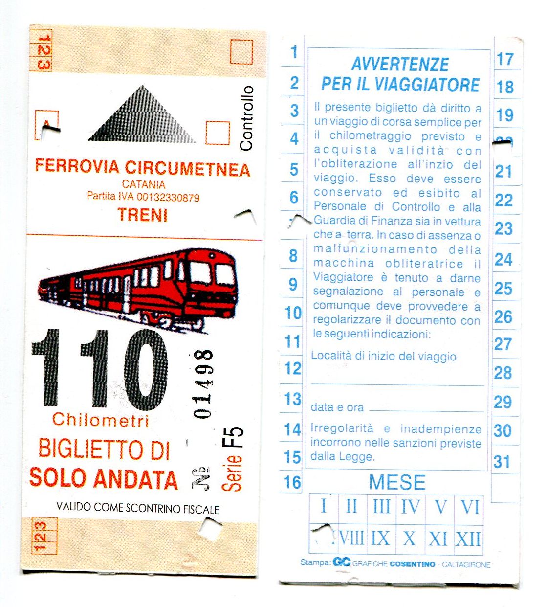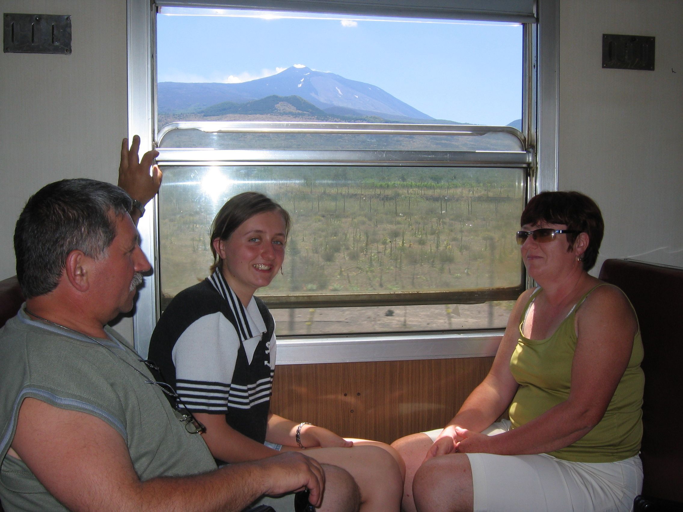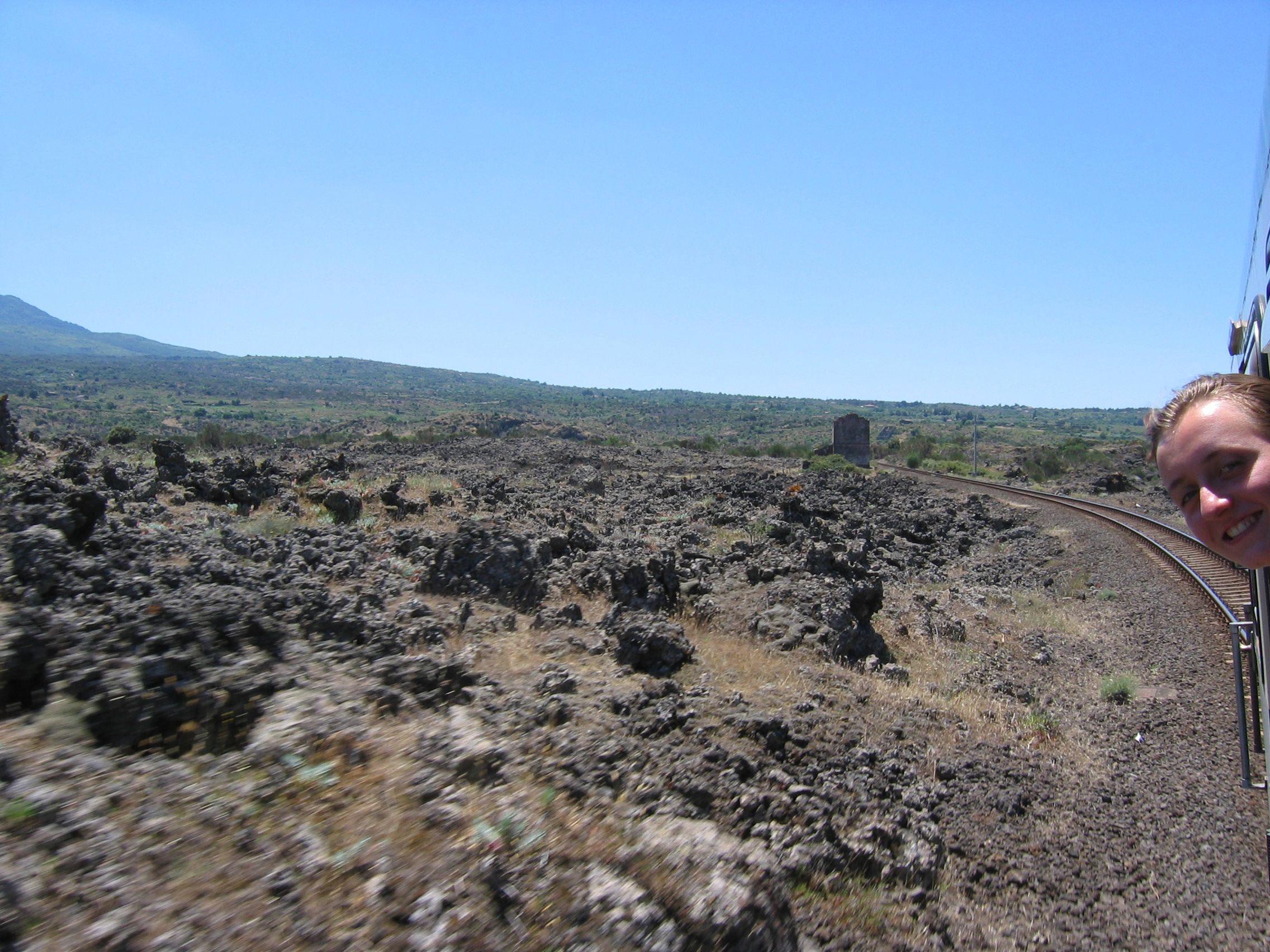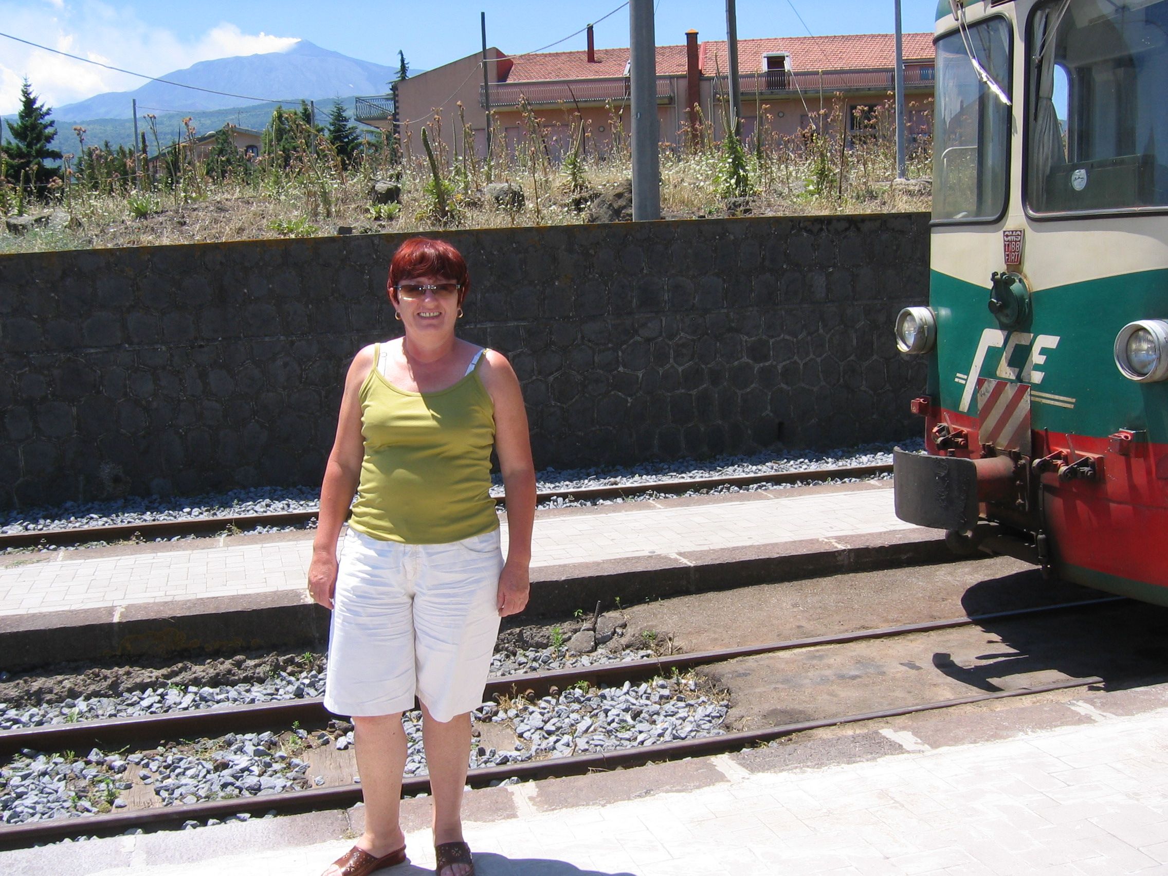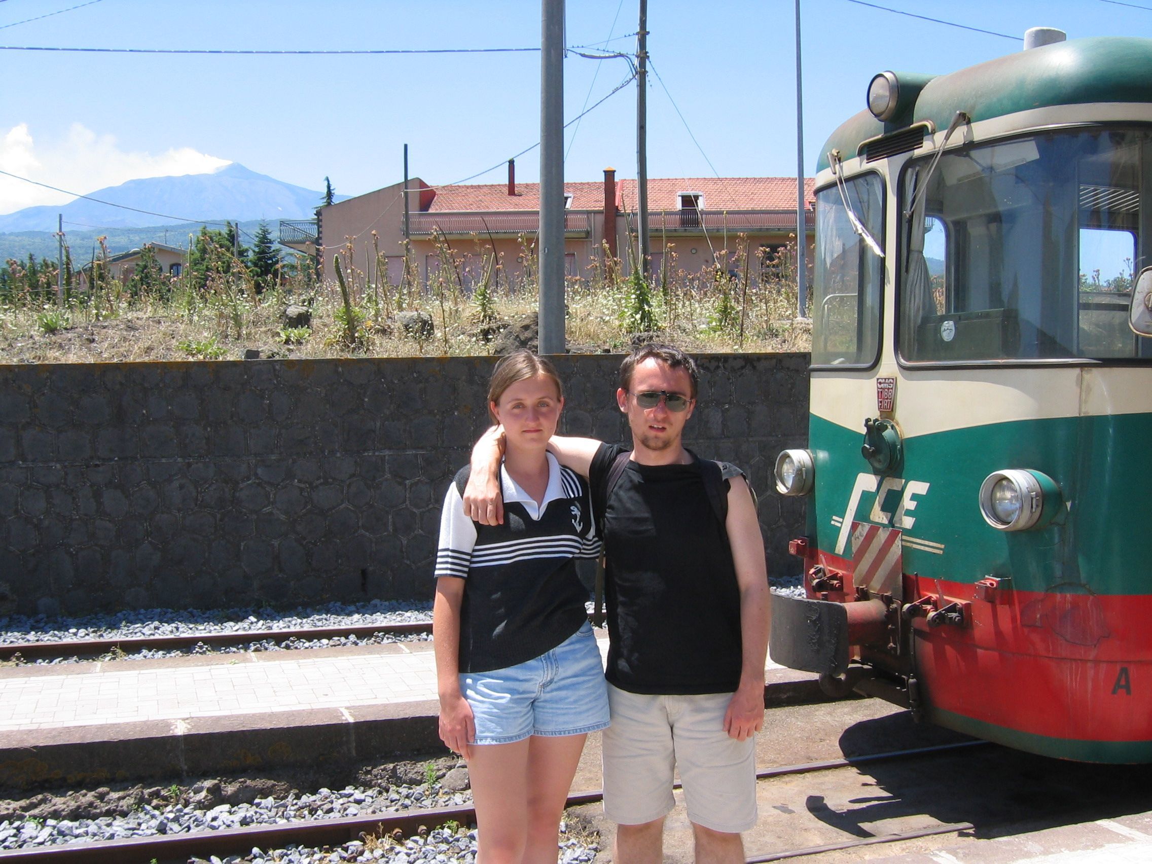 Ze stacji Catania Centrale przeszliśmy na przystanek kolei prywatnych Ferrovia Circumetnea - Catania Borgo. Tam kupiliśmy bilety na podróż pociągiem wokół Etny. Początek Catania Borgo a koniec Giarre. Podróż przebiegała wspaniale. Po drodze było widać wiele zniszczeń po wybuchach wulkanu. Cały czas Etna dymi. Nie przeszkadza to jednak mieszkańcom budować domy nawet w bliskiej odległości Etny.
