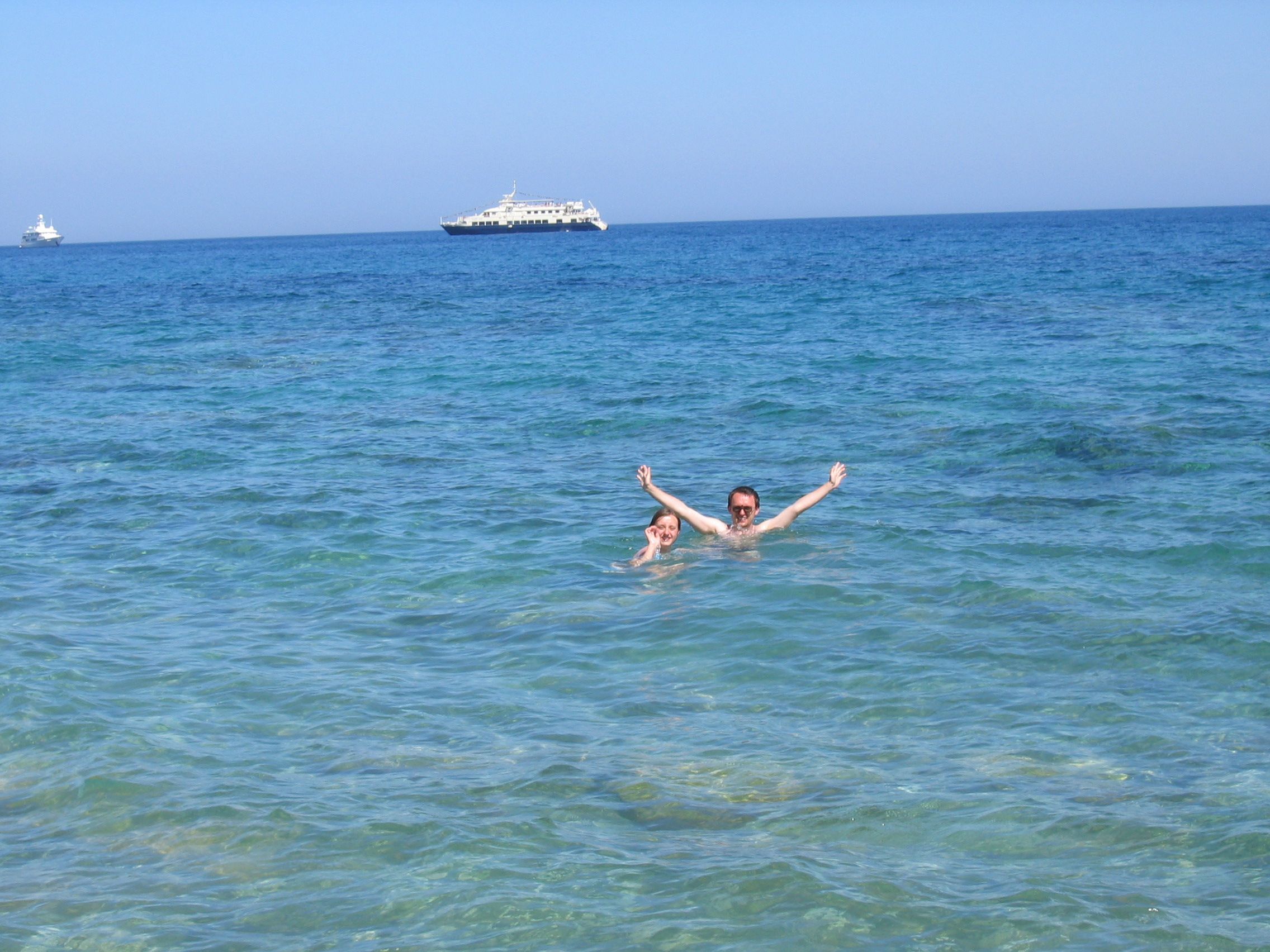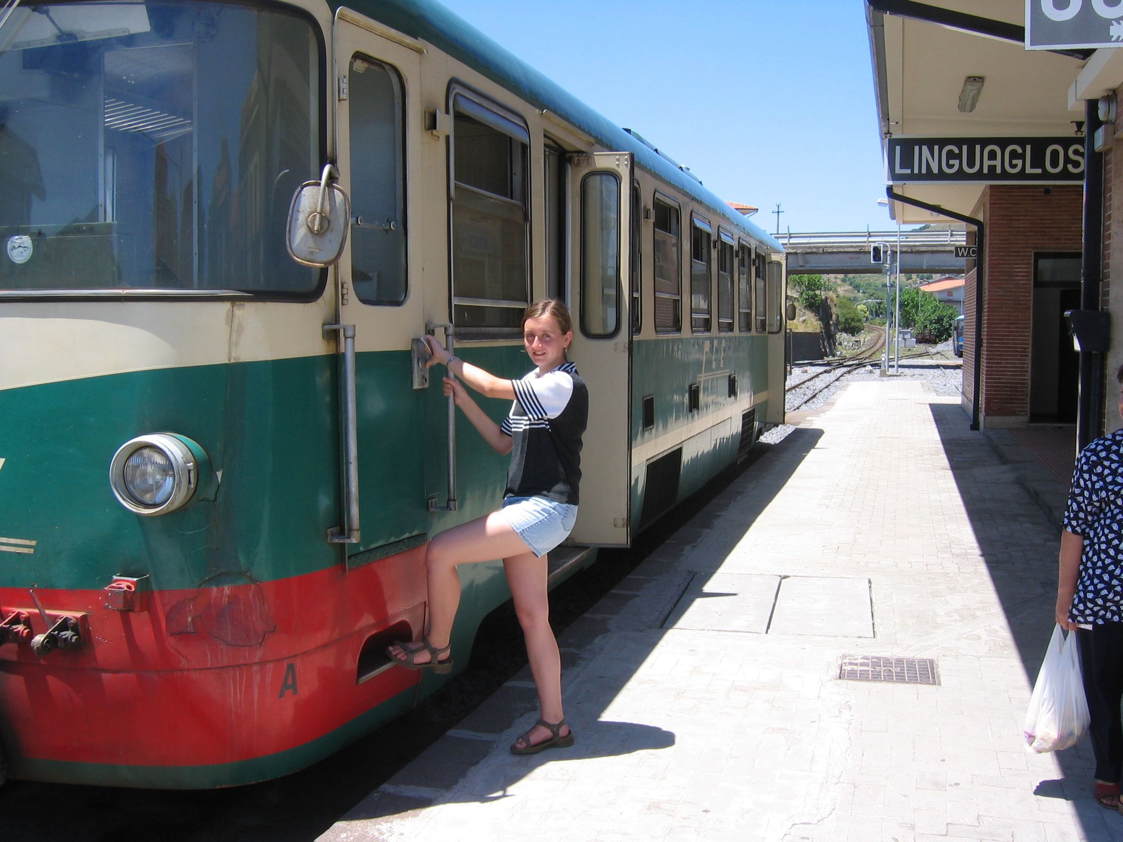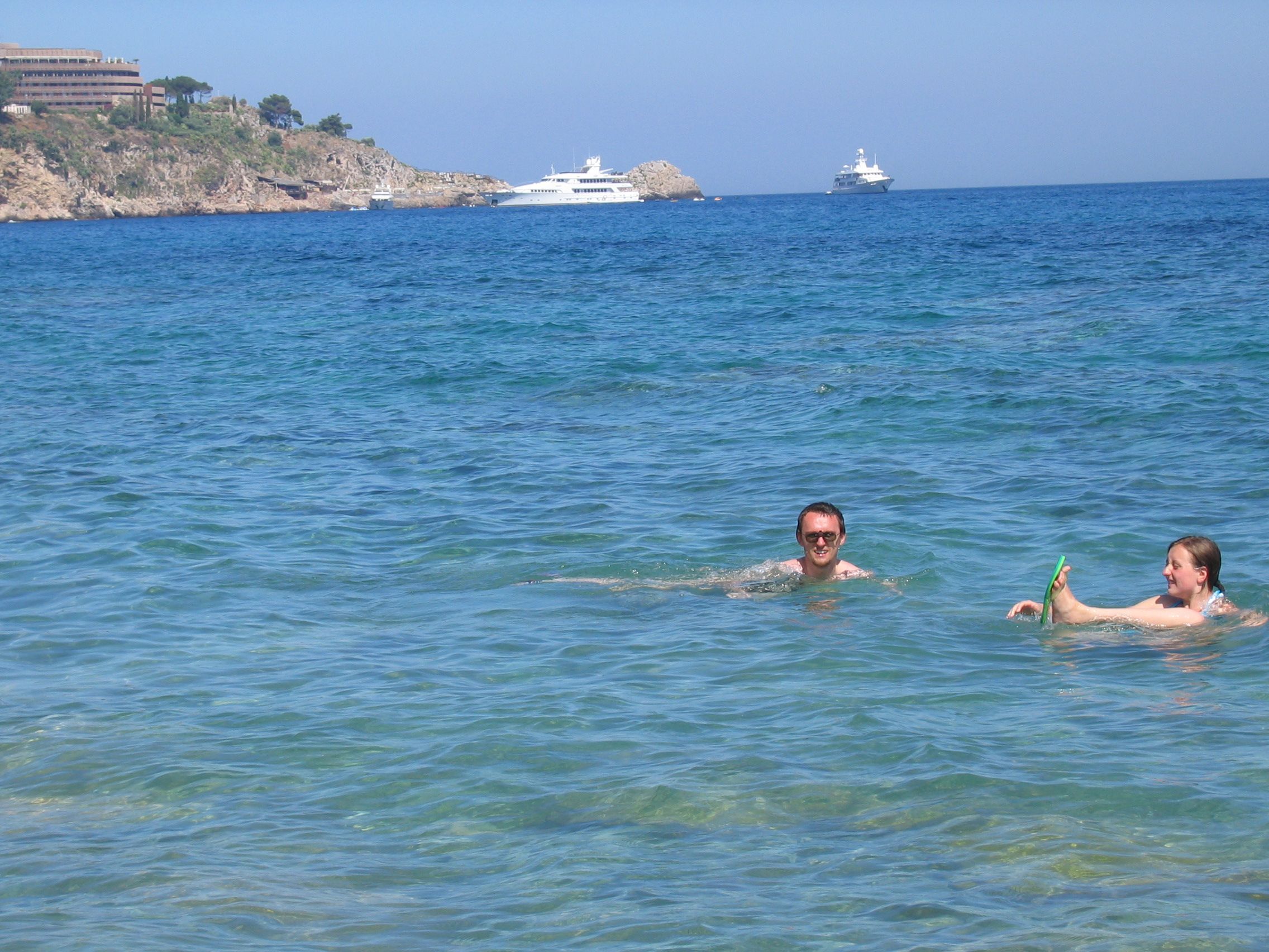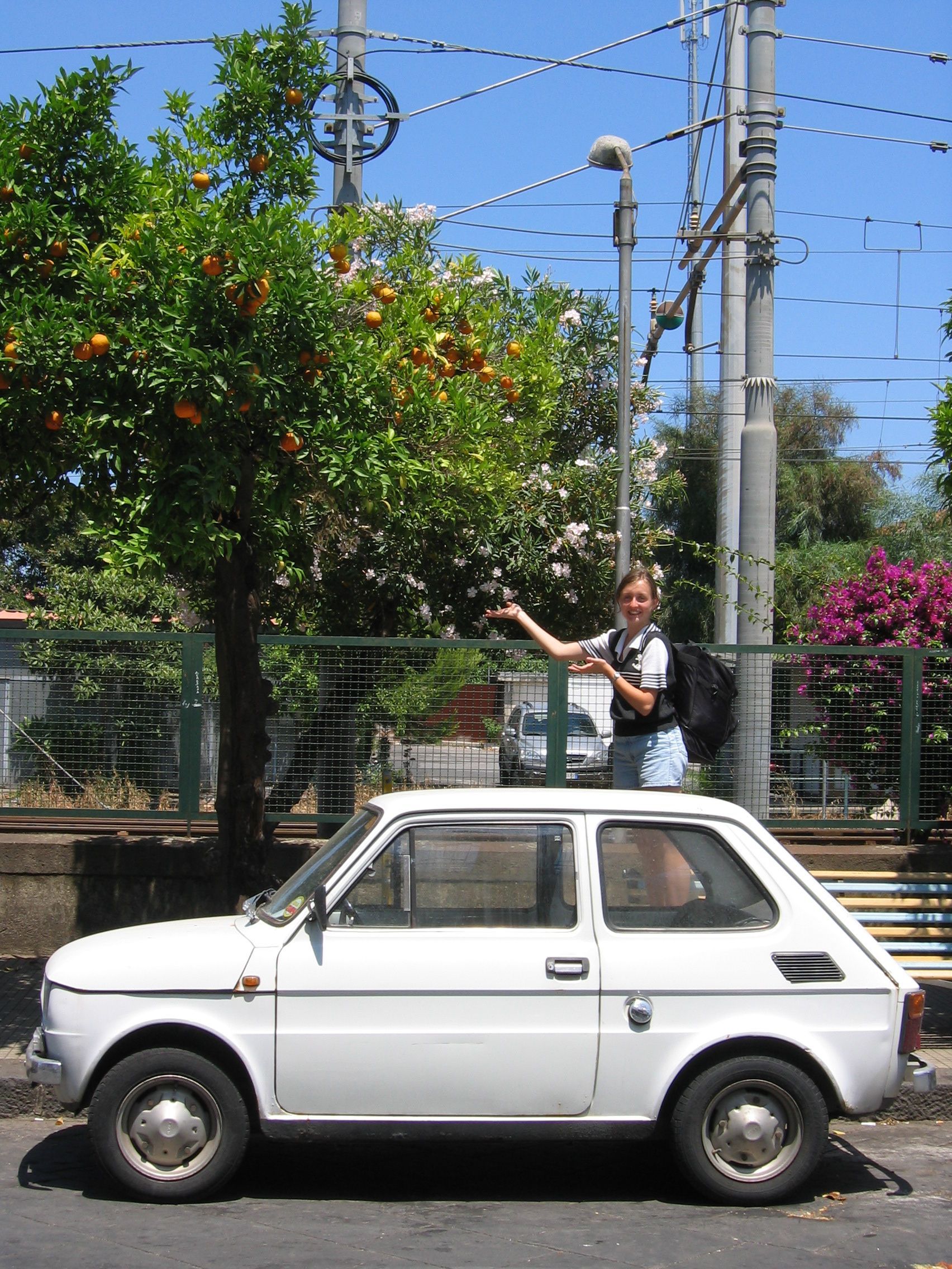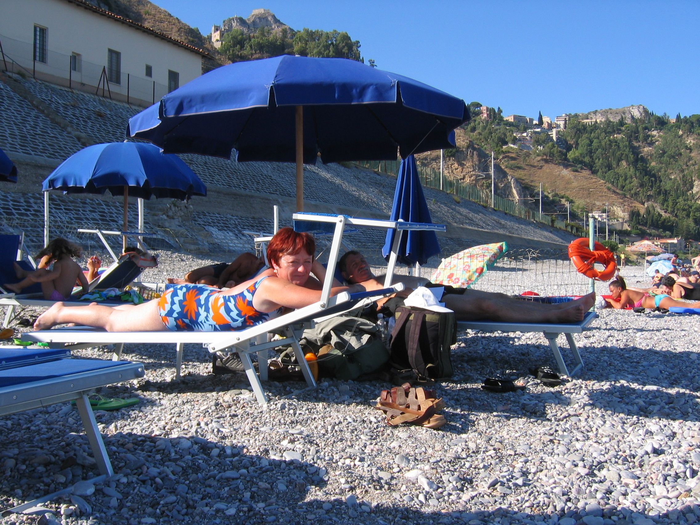 Po przyjeździe na stację Linguaglossa obsługa pociągu powiadomiła nas, że za chwilę podjedzie autobus i zabierze nas dalej. Niestety po ostatniej erupcji Etny nie przejezdny był odcinek pomiędzy kilkoma ostanimi stacyjkami i dalszą podróż odbyliśmy autobusem. Stało się tak jak powiedzieli i autobusem z ciekawym kierowcą pojechaliśmy dalej. Dowieziono nas na stację Giarre-Riposto, skąd za chwile mieliśmy pociąg kolei włoskich do Taormina-Giardini. Natalka zauważyła starego malucha a nad nim rosnące na drzewie pomarańcze. Taormina to piękne miasto. Jest perłą sycylijską nad morzem jońskim. Bardzo ładna zabudowa. Ale zamiast zwiedzać miasto zdecydowaliśmy się na wycieczkę nad pobliskie morze. Wykąpaliśmy się w nim. Łukasz z Natalią mieli wiele radości. Poleżeliśmy też na leżakach. Gdy przyszedł czas na dalszą jazdę pojawiliśmy się na stacji, wsiedliśmy do pociągu i zaczęliśmy podróż powrotną do Rzymu.